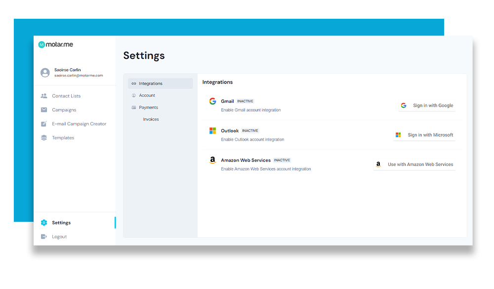 When you log into your motar.me account you can integrate with either Google Gmail or Microsoft Outlook 365.